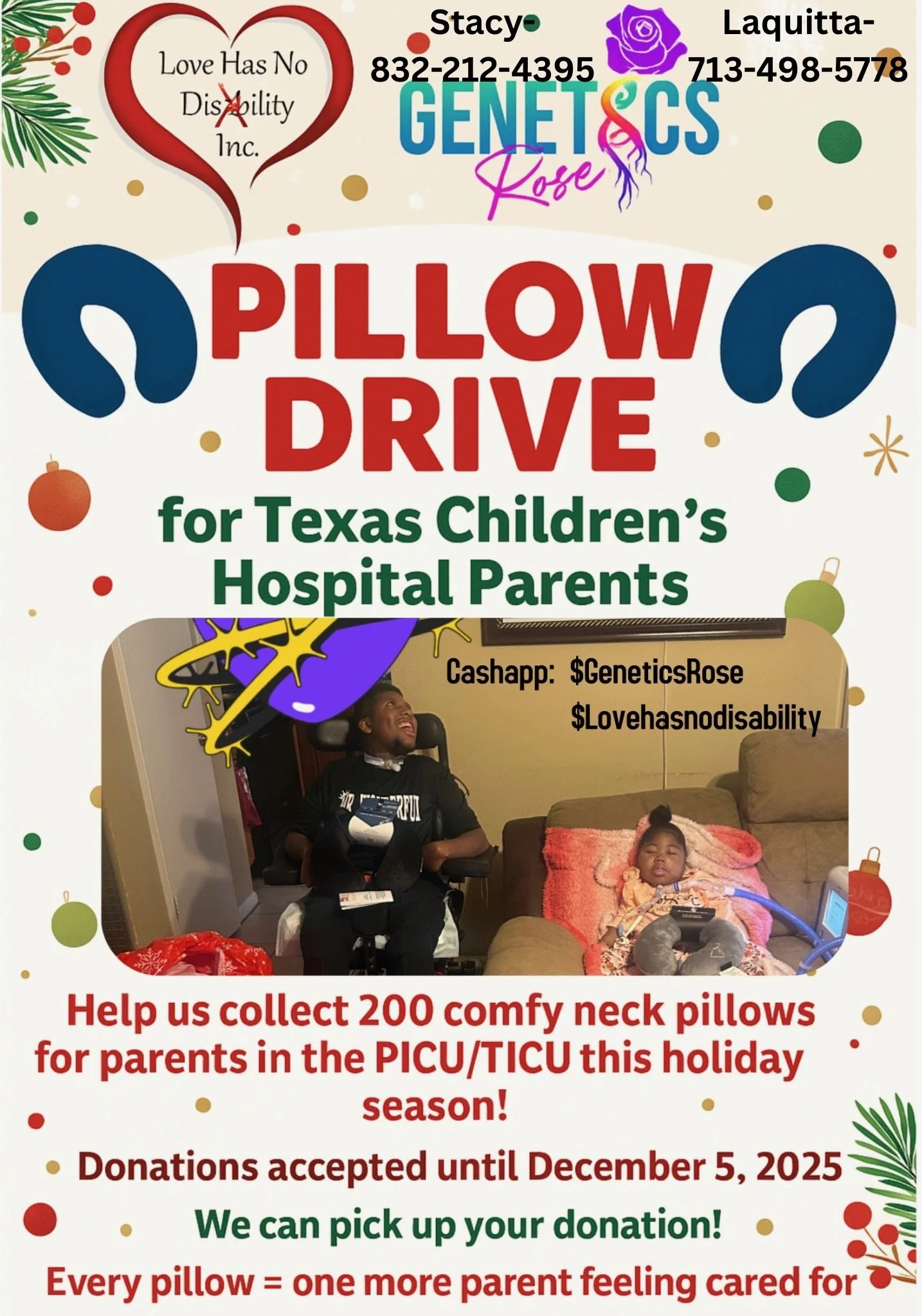 GeneticsRose & Lovehasnodisability is collecting neck pillow to support families at Texas Children’s Hospital while their loved ones are in the TICU/PICU. These small comforts can make long hours at the hospital a little easier and provide much needed support during difficult times.